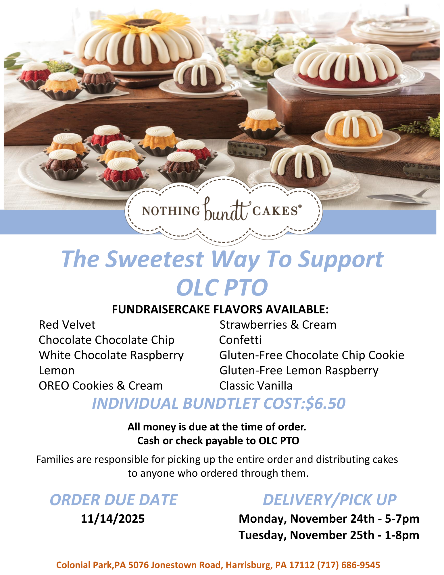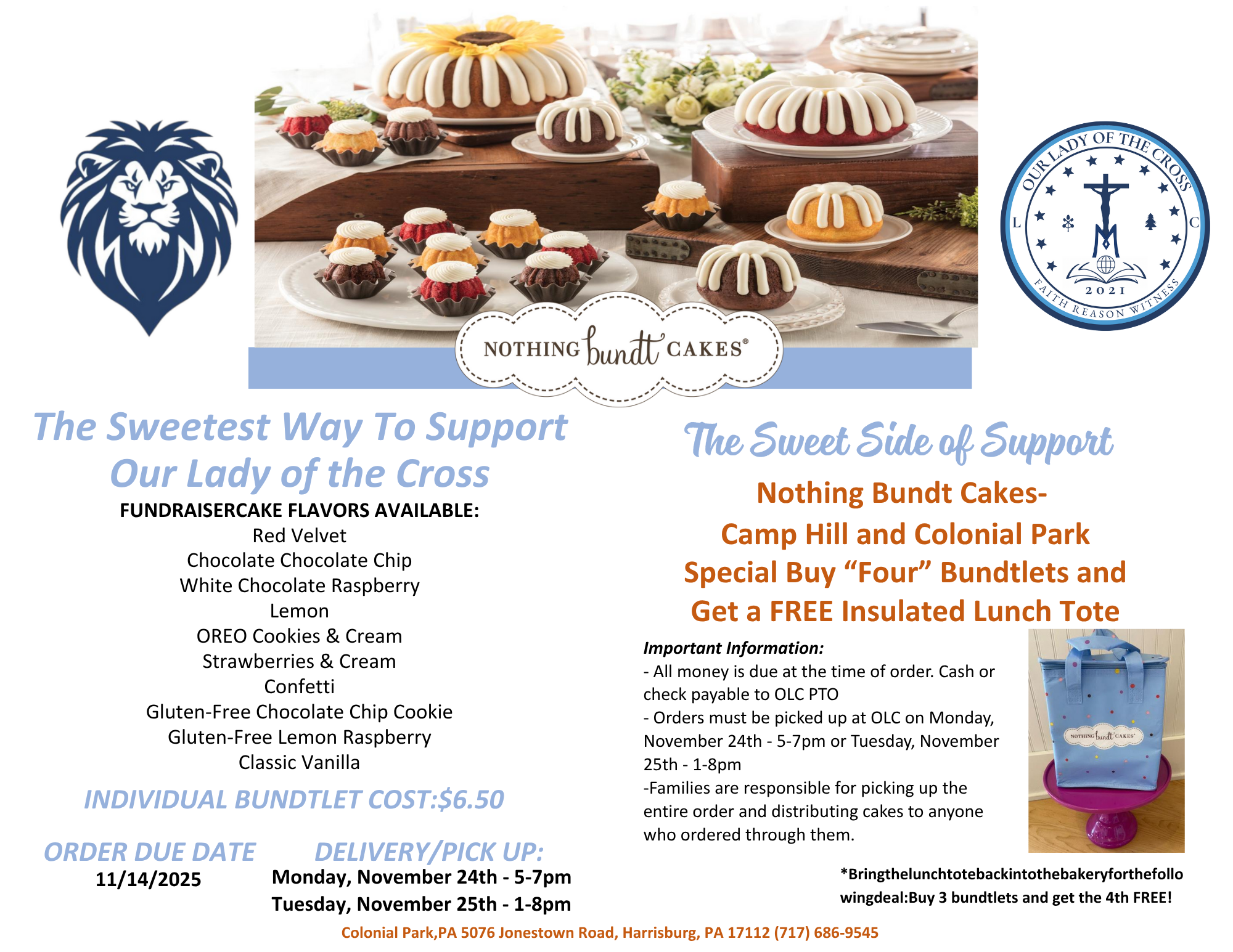 Support OLC PTO with our Nothing Bundt Cakes fundraiser! Choose from a variety of delicious flavors – each Bundlet is just $6.50. Orders are due by November 14th, with pickup at OLC on November 24th & 25th. Buy four and get a free insulated lunch tote!